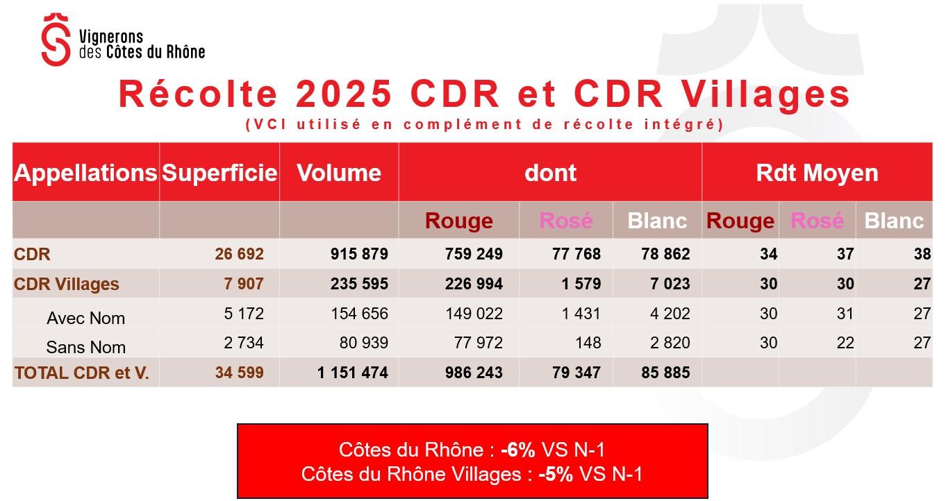 Retrouvez ici le bilan de la récolte 2025 en Côtes du Rhône, Côtes du Rhône Villages (mise à jour au 22/01/2026).