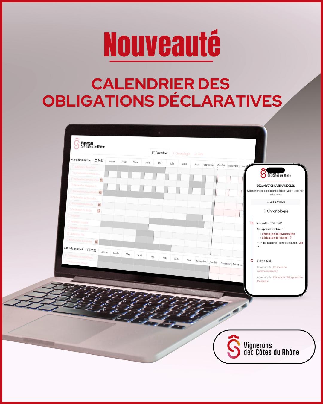 Ce calendrier n’a pas vocation à être exhaustif, mais il regroupe l’essentiel des démarches à connaître pour la filière viti-vinicole. Il est accessible aussi bien sur ordinateur que sur téléphone, pour un usage simple et rapide au quotidien.